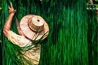 Het beeld straalt een diepe rust en toewijding uit, waarbij de warme tinten van haar traditionele kleding en rieten hoed prachtig contrasteren met het intense groen van het drogend gras. Deze scene vertelt het verhaal van een cultuur waar handwerk nog altijd een centrale rol speelt in het dagelijks leven, waar elke mat die ontstaat een uniek kunstwerk is voortgebracht uit natuurlijke materialen en eeuwenoude wijsheid.
