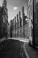 Een schitterende oude straat in Cambridge met historische huizen en mooie lichtval. Door de lichtval lijkt het alsof de lantaarns aan staan.