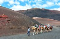 Camel caravan with tourists in the volcanic desert of Timanfaya National Park, Lanzarote island. Spain.