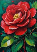 De cameliabloem, weergegeven in acryl op canvas, toont haar zachte, gelaagde bloemblaadjes en glanzende bladeren in levendig detail. Het medium benadrukt de romantische tinten van de bloem - roze, wit en rood - en geeft de compositie een gevoel van elegantie en diepte.