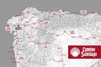 De Camino de Santiago als decoratieve poster. Een overzicht van de verschillende routes en hun verloop: Camino Frances, Camino Portugues, Camino Primitivo, Camino del Norte en Via de la Plata. Stijlvolle designkaart voor pelgrims – ook een geweldig cadeau-idee!
