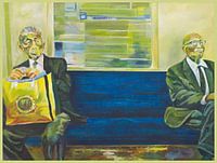 Schilderij, acryl op doek uit de serie "Camouflage" Snapshots van het moderne leven zijn de motieven van Sabine Minten's representatieve schilderkunst. In een kunstmatige enscenering doordringt kleur de picturale ruimte als een vloeistof, als lucht of beter nog: als een immateriële substantie. Mensen lijken ondergedompeld in onwerkelijke kleuren en lichten en daardoor verwijderd van de kijker. De beelden vertellen over vreemde toestanden van opschorting, van ontbinding en inkapseling, van wachten op iets ongedefinieerds.
