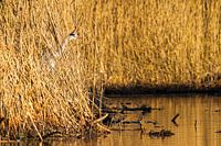Een reiger verstopt zich in het riet aan het water in het avondlicht