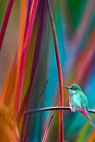Kleurrijke fotomontage, een mooi exotisch vogeltje,een bijeneter, met camouflerende kleuren in het riet