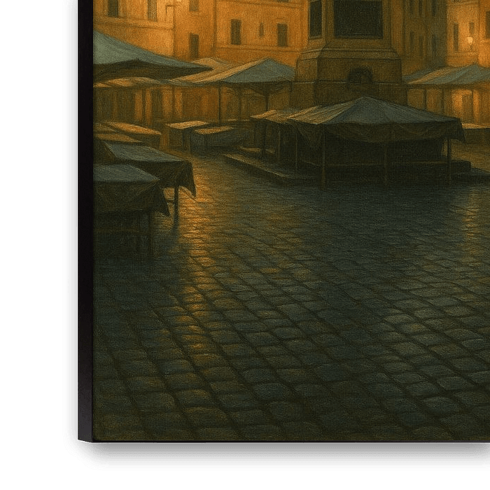 Campo de' Fiori Serenity legt het Romeinse plein vast in de schemering, ontdaan van marktdrukte en geluid. Het standbeeld van Giordano Bruno staat wachtend onder een indigoblauwe hemel, de marktkramen opgevouwen en wachtend op de ochtend. Om hem heen gloeien de gevels met lamplicht, hun ramen stralen de zachte amberkleurige tint uit die Hopper's tijdloze stedelijke eenzaamheid definieert.