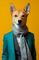 Een fascinerend gezicht: Met zijn slanke bouw en alerte, rechtopstaande oren straalt de Kanaänhond zowel elegantie als intelligentie uit. De zachte kleuren van zijn vacht harmoniëren perfect met een stijlvolle outfit en een casual sjaal, terwijl de heldere achtergrond het charisma van zijn karakter nog eens onderstreept. Een echte blikvanger!