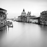Canal Grande en Santa Maria della Salute kerk in Venetië, Italië. Jaar 2010. Zwart-wit fotografie lange belichting foto.