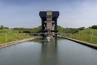 Zonnig uitzicht op het Canal du Centre in Le Rœulx, Henegouwen, Wallonië, België. De scheepslift van Strépy-Thieu / L'ascenseur funiculaire de Strépy-Thieu is zichtbaar in het midden van het beeld, omringd door een landschap van zacht glooiende heuvels op de achtergrond. Het industriële oriëntatiepunt wordt weerspiegeld in het water en creëert symmetrie en evenwicht in de foto.