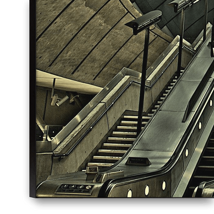 Metro station in Londen bij Canary Wharf. Een modern station onderdeel van de Jubilee Line (een cadeau van de stad aan Koningin Elisabeth). op de foto een symmetrische weergave in HDR met erg veel textuur van dit industriële station.