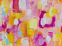 'Candy Carnival' doet denken aan feest, confetti, suikerspinnen, vrolijkheid! Met dit beeld haal je sowieso een warm gevoel in huis. Het handgeschilderde origineel werkje is in diverse lagen opgebouwd, met in de laatste laag frisse koele blauwe accentjes die sprankelen tegen de warme achtergrond