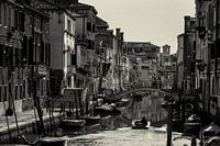 Een langzaam varend bootje maakt golven die mooi weerspiegelen in het tegenlicht. Fot genomen in de wijk Cannaregio van Venetië.