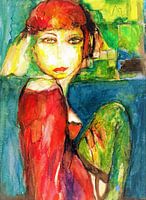 Pierrette / Clown / Vrouw / Circus / Illustratie / Kinderkamer / Portret / Vrolijk / Kleur / Rood / Groen / Blauw / Kan het circus niet vinden / Kan je me de weg vertellen? / Aquarel op canvas / Abstracte kunst / Figuratieve kust