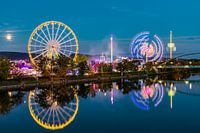 Reuzenrad en andere attracties tijdens het Cannstatter Volksfest op de Cannstatter Wasen in de avonduren in Stuttgart, Baden-Württemberg, Duitsland.