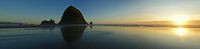 Haystack rock bij Cannon beach, Oregon, USA is een icoon van de westkust van Amerika. De zonsondergang, met laag water en reflectie van de rots op het strand is geweldig om mee te maken.
