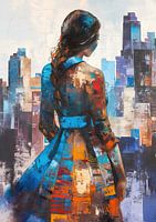 Canvas Cityscape - Dit vrouw schilderij verbeeldt een ongenoemde vrouw in een kleurrijke jurk waarin een stedelijk panorama is verweven, uitgevoerd in een dynamische, moderne schilderstijl met krachtige stedelijke elementen.