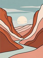 Dit fascinerende kunstwerk nodigt je uit voor een reis door een sereen canyonlandschap, weergegeven in een opvallende moderne illustratieve stijl. Lagen van aardetinten, van diepe terracotta en rijke roest tot zachte blush en romig beige, vormen de majestueuze rotsformaties die een rustige turquoise rivier omlijsten die zich zachtjes…