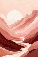 Dit kunstwerk toont een sereen canyonlandschap in warme tinten. Vloeiende lijnen van rotswanden en een meanderende rivier creëren diepte, terwijl een grote witte cirkel een dromerige sfeer oproept. De zachte roze en rode tinten geven het werk een warme uitstraling. Abstracte vormen verlenen een moderne twist aan het natuurlijke tafereel. Het geheel straalt rust en harmonie uit, en nodigt de kijker uit zich onder te dompelen in dit gestileerde landschap.