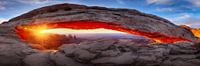 Op de foto zie je de Mesa Arch, een rotsboog die bij zonsopgang van onderaf wordt verlicht door de zon en daardoor rood begint te gloeien.