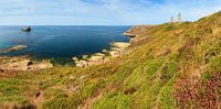 Prachtige panoramische opname van de kustlijn van Cap Frehel aan de smaragdkust in Bretagne, Frankrijk, met bloeiende heide in de zomer en eiland Amas du Cap voor de kust in de Atlantische oceaan en de vuurtoren op de klif