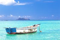 Vissersboot in de turquoise wateren van Cap Malheureux in het noorden van Mauritius, Afrika.