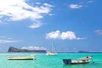 Vissersboten in het turquoise water van Cap Malheureux in het noorden van Mauritius, Afrika.