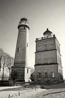 De twee vuurtorens van Kap Arkona aan de Oostzeekust op het Duitse eiland Rügen. Zwart-wit fotografie.