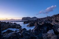Een mysterieus maanlandschap ontstaat doordat de foto na zonsondergang is gemaakt op statief met lange sluitertijd. De branding die tussen de rotsen van gestolde lava slaat zorgt door de lange sluitertijd voor een mysterieus nevel. De Capelinhos vulkaan op de achtergrond is in 1957 uitgebarsten en veroorzaakte naast nieuw land ook veel…