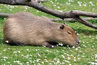 Deze capibara lag lekker in het zonnetje te genieten.Het groene gras met de madeliefjes vormt een mooie achtergrond, waardoor de capibara goed tot zijn recht komt.