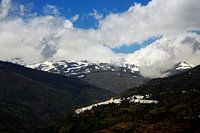Capileira, het hoogste dorpje aan de zuidkant van de Sierra Nevada, de Alpujarren, met op de achtergronden de besneeuwde toppen van de Zuid-Spaanse bergrug.