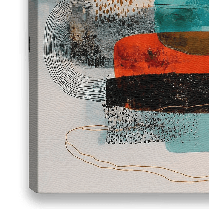 Een modern abstract kunstwerk met een compositie van overlappende, semi-transparante rechthoekige vormen in diverse levendige kleuren. Subtiele texturen en patronen, zoals zachte penseelstreken, spetters en lineaire ontwerpen voegen diepte en interesse toe. Fijne lijnen en stippen in contrasterende kleuren versterken de complexiteit van…