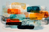 Een modern abstract kunstwerk met een compositie van overlappende, semi-transparante rechthoekige vormen in diverse levendige kleuren. Subtiele texturen en patronen, zoals zachte penseelstreken, spetters en lineaire ontwerpen voegen diepte en interesse toe. Fijne lijnen en stippen in contrasterende kleuren versterken de complexiteit van…