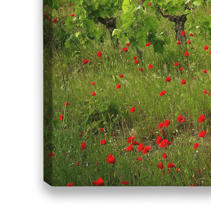 Op de voorgrond zie je een wijngaard met rood bloeiende klaprozen.