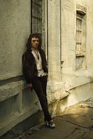 Carel Fabritius, een meesterlijke Nederlandse kunstschilder uit de 17e eeuw, staat oog in oog met een oude mergelmuur in het heden. Fabritius, gekleed in zijn traditionele schilderskostuum met een elegante zwarte cape die zachtjes in de wind wappert, straalt creativiteit en nieuwsgierigheid uit. Zijn weelderige, golvende haar en intense blik benadrukken zijn kenmerkende verschijning.