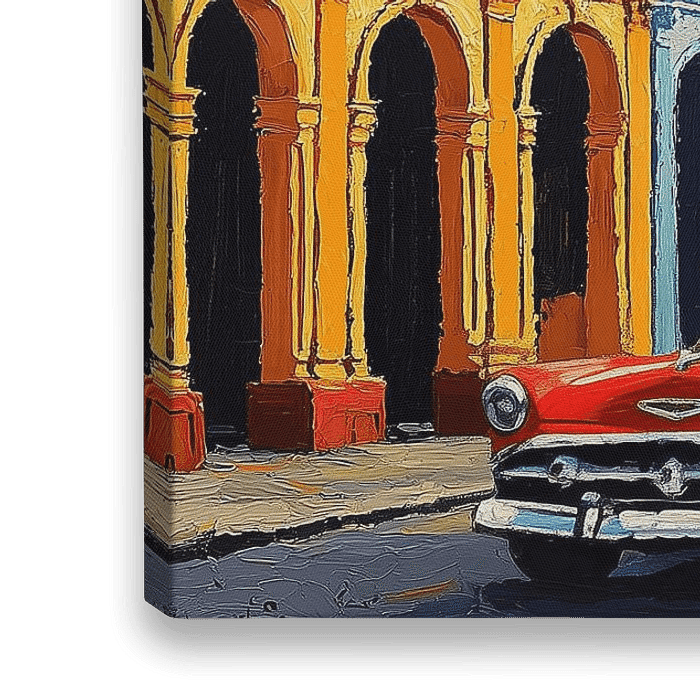 Een klassieke rode oldtimer, glanzend en trots, rijdt door de schilderachtige straten van Havana, een symbool van het verleden dat moeiteloos samenleeft met het heden. De elegante architectuur met haar koloniale bogen en verweerde gevels toont een levendig palet van okergeel, hemelsblauw en zachtgroen. De ramen en balkons fluisteren verhalen van een stad vol passie, muziek en nostalgie.
