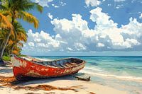 Het olieverfschilderij legt de stille maar indrukwekkende schoonheid van een Cubaans strand vast, gedomineerd door een oude rode boot die eenzaam op het witte zand ligt. De afbladderende kleur van de boot vertelt verhalen van vroegere avonturen en geeft het tafereel een nostalgisch tintje.
