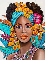 Caribbean uitstraling: Dompel jezelf onder in de levendige schoonheid van dit schilderij met een Caribische vrouw versierd met kleurrijke bloemen en make-up. Een prachtig feest van cultuur en levendigheid.