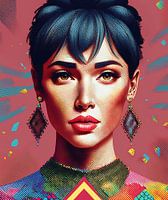 Een kleurrijk portret van een vrouw met een opvallende uitstraling, afgebeeld in een moderne, grafische kunststijl. Haar sieraden en expressieve gelaatstrekken worden versterkt door de levendige kleuren en geometrische accenten. De compositie straalt energie en verfijning uit.