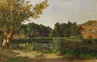 Carlos de Haes-Lagoon Landschap, wilde eendenjacht bij de rivier, Antique landschap