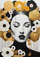 Dit opvallende kunstwerk, ontworpen als eyecatcher voor je huis, toont een elegant portret van een vrouw verweven met boeiende geometrische vormen en goudgele bloemen. Haar gelaatstrekken worden benadrukt door de strakke lijnen en vormen om haar heen, terwijl de bloemen een zachte en organische touch toevoegen aan het geheel. De combinatie van geometrie en natuurlijke elementen creëert een harmonieus samenspel van contrasten, waardoor het kunstwerk zowel eigentijds als tijdloos aanvoelt. Dit kunstwerk zal niet alleen de esthetiek van je ruimte verheffen, maar ook een verfijnde en boeiende atmosfeer creëren die de aandacht van elke bezoeker zal trekken.