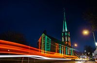 Katholieke kerk in carnavalskleuren en lichtsporen van verkeer in het dorp Meijel in de gemeente Peel en Maas in Limburg, Nederland.