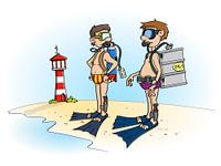 “duikvakantie” Vrolijke en kleurrijke cartoon over twee duikers.