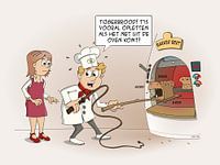 "Tijgerbrood, het is vooral opletten als het net uit de oven komt." Vrolijke Nederlandstalige cartoon over een bakker die een brood uit de oven haalt.