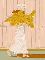Haal het vakantiegevoel in huis met Casa Mimosa! Deze vrolijke zomerse illustratie laat een vrouw zien in een zwierige witte rok, haar gezicht verstopt achter een enorme bos mimosa. Ze wandelt langs een charmante lichtroze deur met het bordje “Casa Mimosa”.