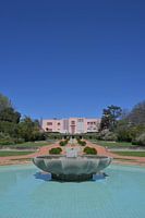Het roze Casa de Serralves staat majestueus onder een stralend blauwe lucht. Op de voorgrond leidt een grote, reflecterende vijver het oog door de perfect onderhouden tuinen naar het statige gebouw. Het geheel wordt omlijst door weelderig groen, wat bijdraagt aan een sfeer van serene luxe.