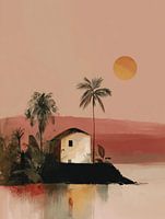 Een tropisch tafereel vol rust en warmte. Een eenvoudig huis staat verscholen tussen palmbomen en weelderige planten, terwijl de zon langzaam zakt achter de roze gloed van de horizon. Het water weerspiegelt de kleuren van de avond en een vogel rust op een palm, alsof de wereld even stilstaat. Dit werk ademt stilte, natuur en de magie van tropische avonden.