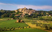 De Italiaanse provincie Toscane biedt prachtige landschappen en vergezichten. Favoriet daarbij zijn de glooiende heuvels met dorpen die er hoog boven uit torenen. Verder wordt het landschap bepaald door de iconische olijfbomen, cipressen en wijngaarden. Bij deze foto zien we een uitzicht op de stad Casale Marittimo in het gouden uur.