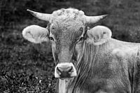 Verleidelijke stier, het enige wat ontbreekt is een knipoog; motief uit de koe-fotoserie " Menschlich" van Anna Köhne; zwart-witfotografie.