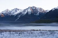De zon gaat onder en er kondigt zich een ijskoude avond aan in Cascade Creek campsite, nabij Milford Sound, Nieuw-Zeeland.