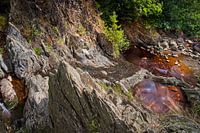 Slechts een kleins straaltje water loopt in de droge zomer naar beneden in de waterval van Bayehon in de Belgische Ardennen in de buurt van Longfaye.