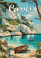 Een idyllisch tafereel van Cassis, beroemd om zijn prachtige calanques. Dit kunstwerk belicht kristalhelder turquoise water, dramatische kalkstenen kliffen en zonnebaders die genieten van de serene mediterrane kustlijn.